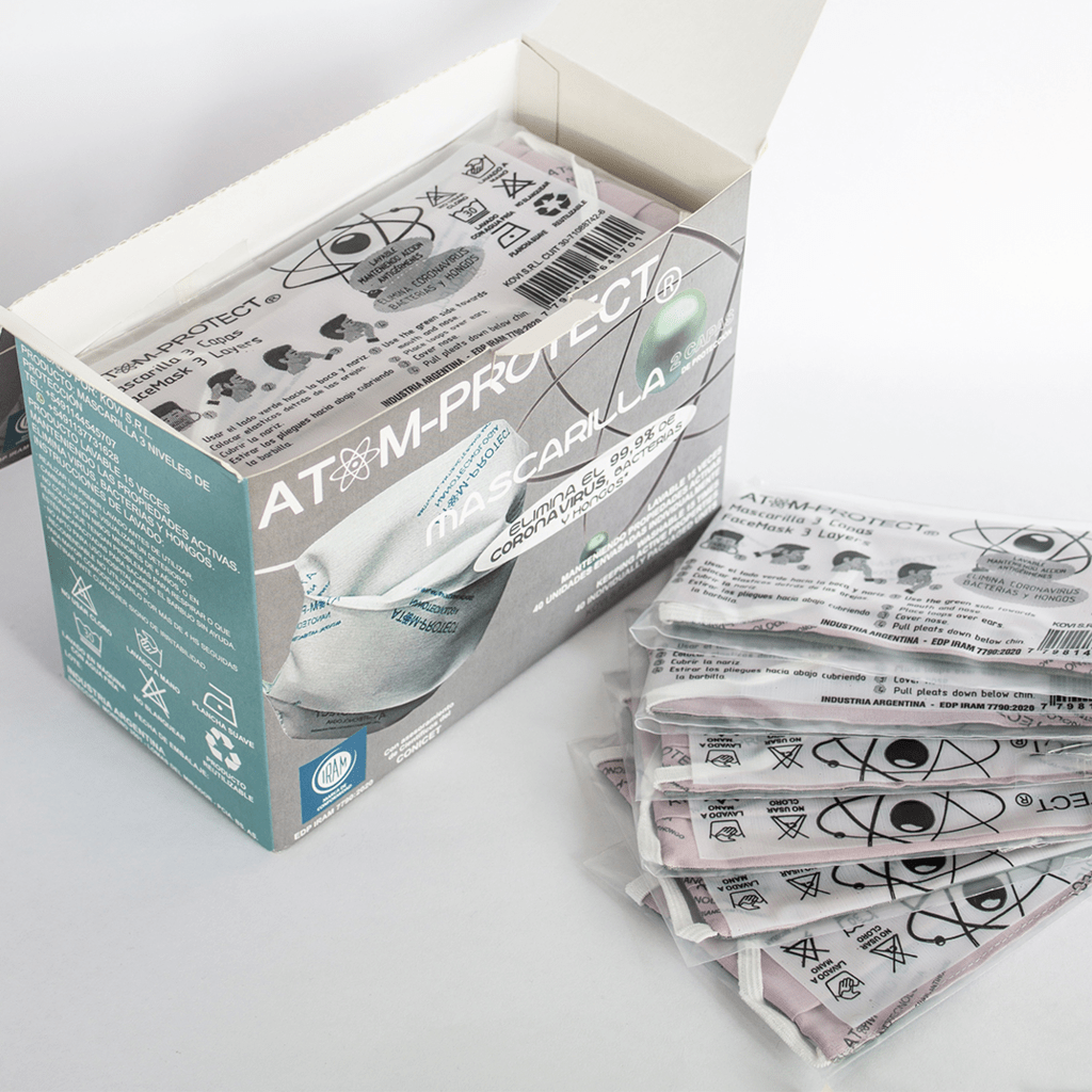 El barbijo Atom Protect es uno de los productos en tendencia de venta en los últimos meses y no es casualidad: es un barbijo desarrollado en nuestro país por el sector privado, con el aporte de la Universidad de Buenos Aires, la Universidad de San Martin y el CONICET; analizados y certificados por el INTI y el INTA respectivamente, con respecto a sus propiedades antibacteriales, antivirales y antihongos.